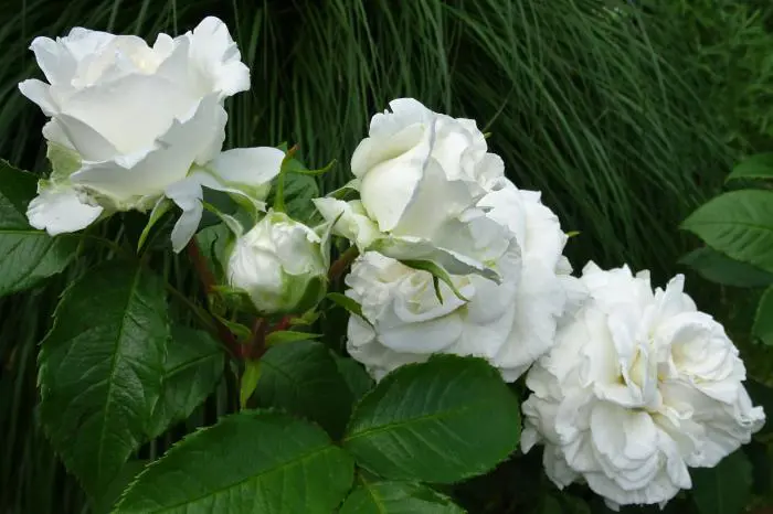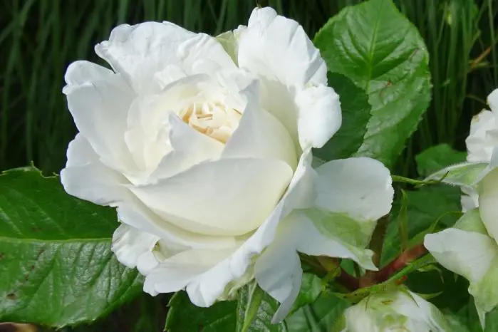 Rosa 'Annapurna' est une rose compacte ferme avec des roses blanches doubles, fortement parfumée au miel et au thé. Les fleurs tolèrent très bien la pluie et la chaleur. Floraison de juin à novembre.