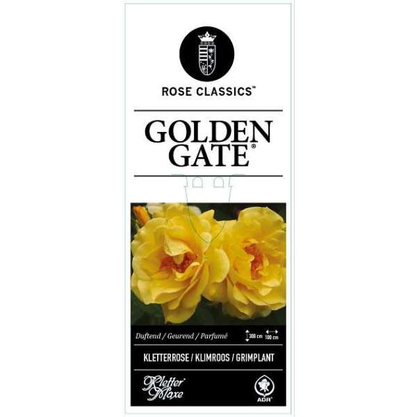 Rosa 'Golden Gate' est une rose parfumée à fleurs continues avec des fleurs jaune doré très double.