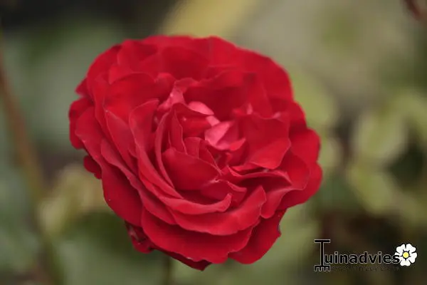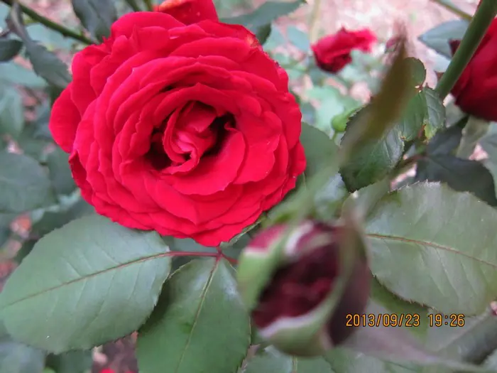 Rosa 'Nina Weibull' fleurit avec des roses rouges sang, bien remplies.
