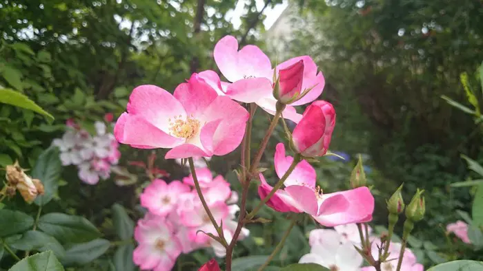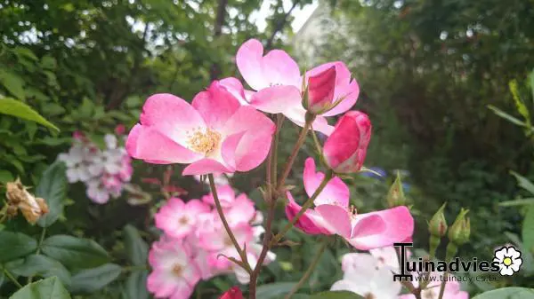Un rosier à fleurs continues avec des grappes de petites roses uniques, rose carmin avec du blanc au centre. Un doux parfum fruité.Les feuilles sont vert foncé et légèrement brillantes.