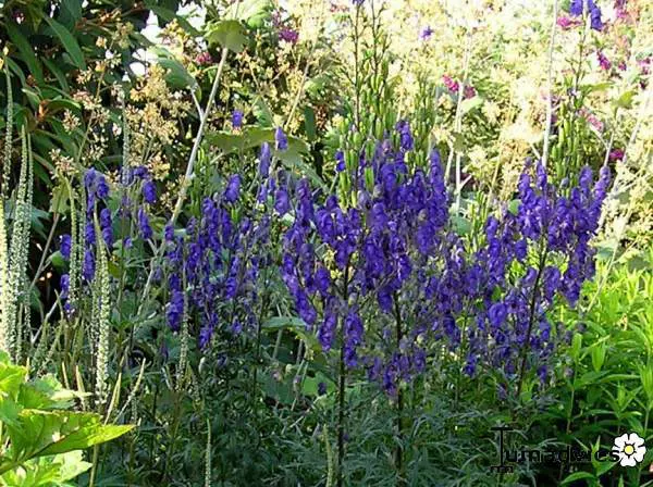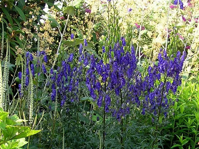 Aconitum napellus « Newry Blue » est un acônement vivace aux tiges hautes décorées de fleurs bleu marine veloutées en forme de casque.