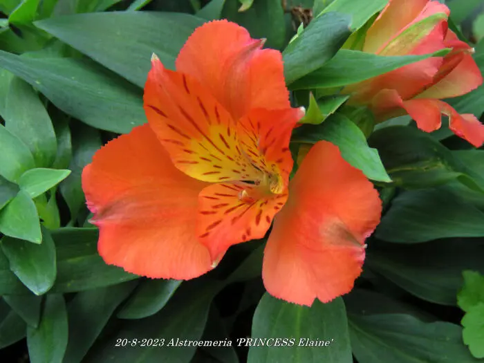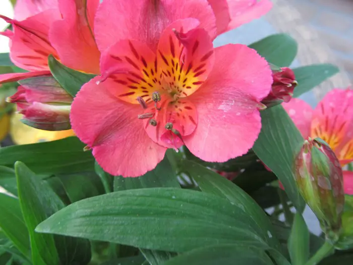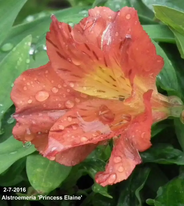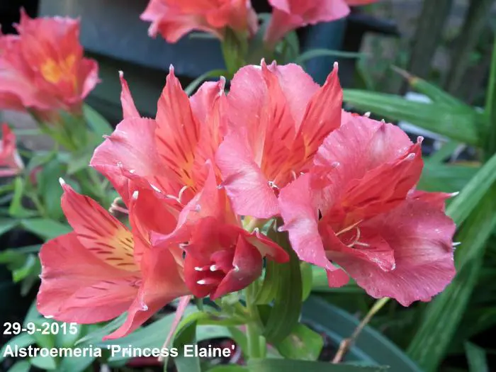 Alstroemeria 'PRINCESS Elaine' fleurit avec des fleurs rose saumon avec une tache jaune doré au centre et des taches/fines rayures brun châtaigne.