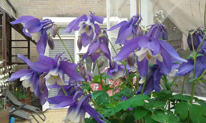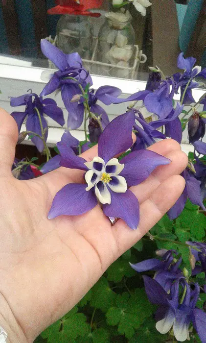 Aquilegia flabellata 'CAMEO Blue & White' a des tiges dressées avec des fleurs dressées à inclinées, avec des pétales extérieurs bleu violet profond et des pétales intérieurs blancs crème.