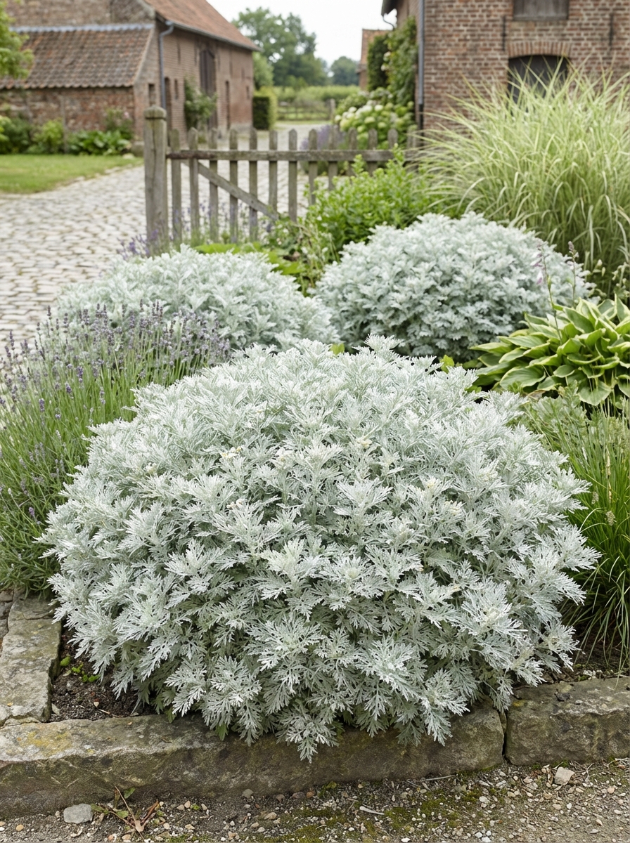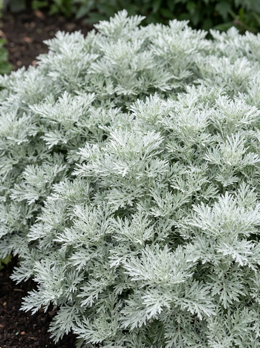 Artemisia 'Powis Castle' est une grande plante arbustive ronde et large, aux feuilles très finement hachées et très aromatiques gris argenté.
