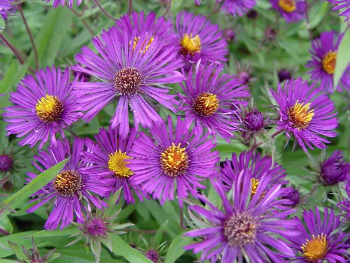 Elle fleurit abondamment en automne avec des têtes florales violettes vives et de fines pétales linéaires autour d’un centre jaune doré.