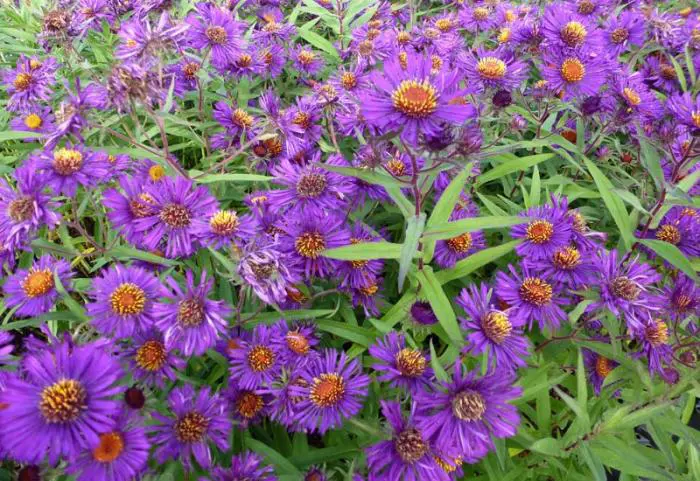 Aster novae-angliae 'Violetta' est une vivace vigoureuse et dressée, avec des tiges fines et ramifiées et des feuilles étroites, lancéolées et vert foncé.