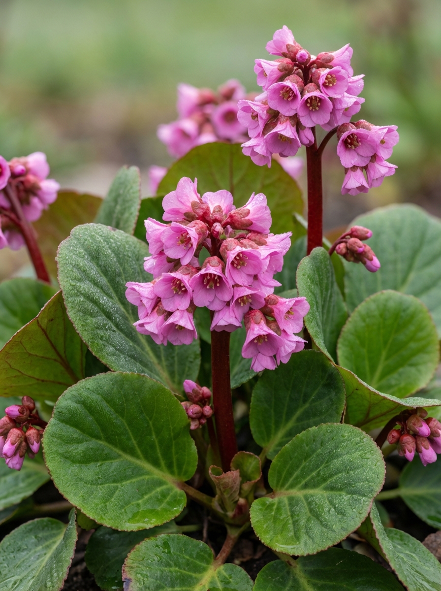 Bergenia DRAGONFLY 'Sakura' fleurit avec des fleurs semi-doubles rose pâle.