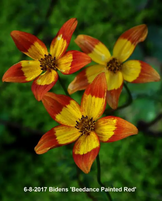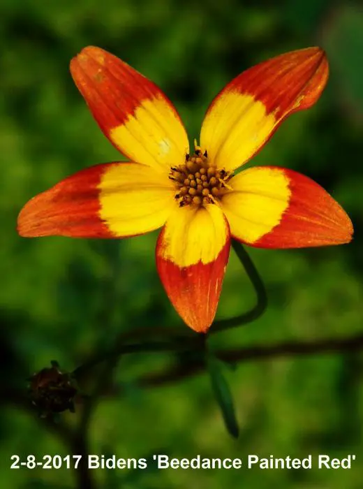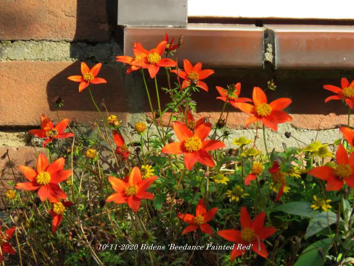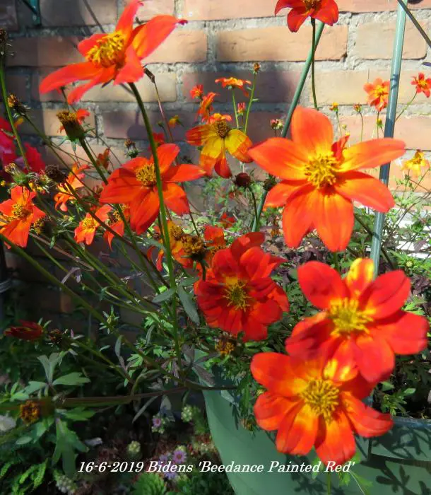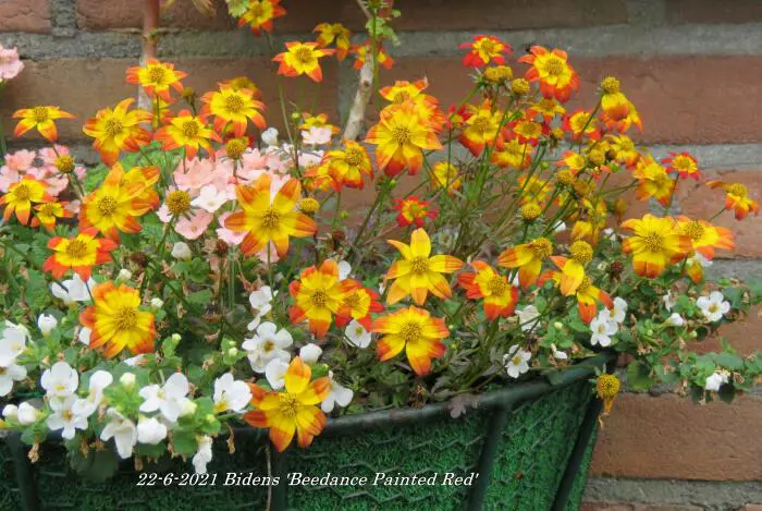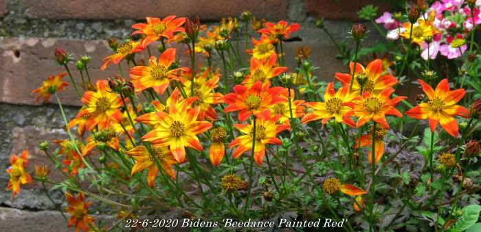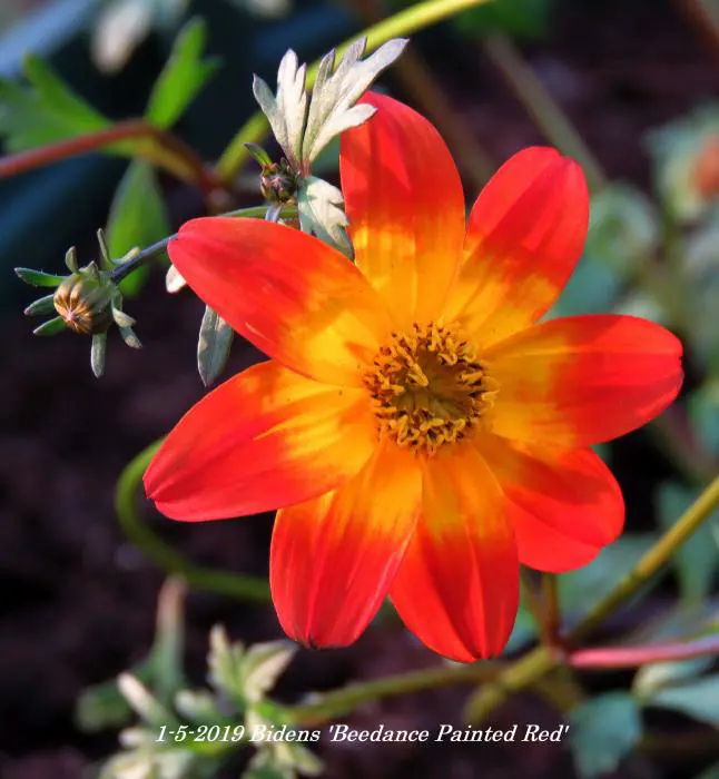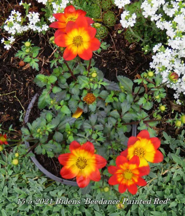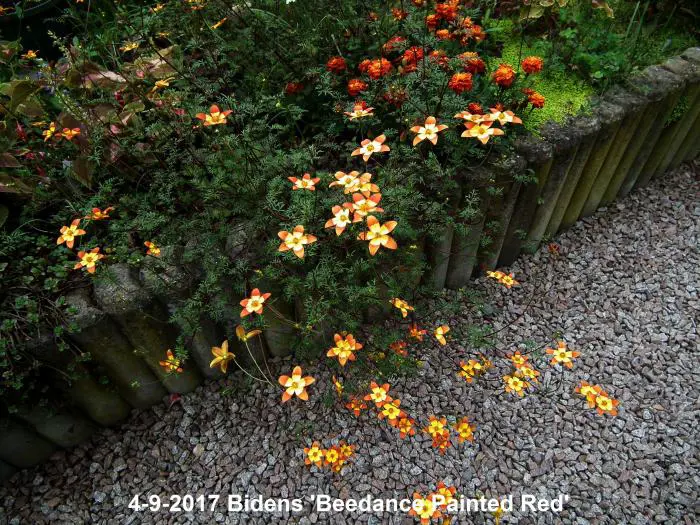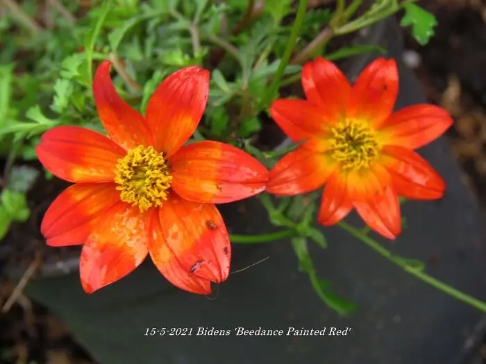 La « Beedance peinte en rouge » de Biden est une plante annuelle avec de petites fleurs ressemblant à des marguerites. Les fleurs sont entièrement rouge-orangées au début, mais plus tard en été, elles jaunissent davantage au cœur.