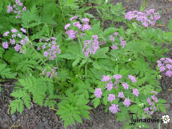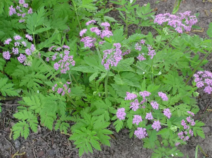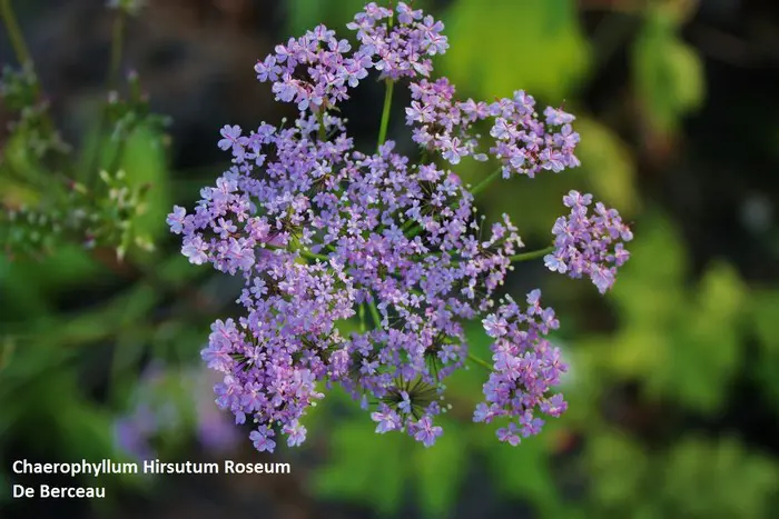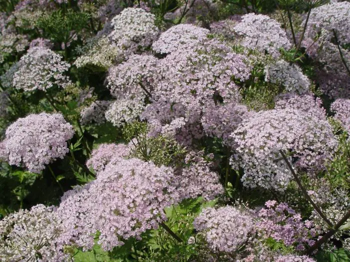 Appartient à la famille des umbelliferes. Pousse dans un sol qui n’est pas trop sec et nutritif.Fleurs rose-lilas en mai/juin avec de grandes ombelles ; hauteur 60 cm ; Les feuilles sentent bien les pommes.