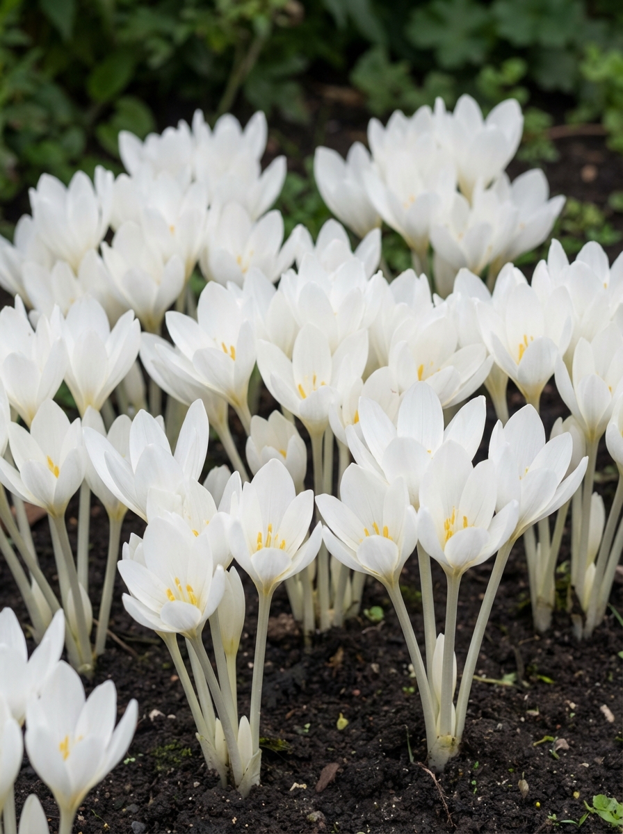 Colchicum autumnale 'Alba' fleurit avec des fleurs blanches.