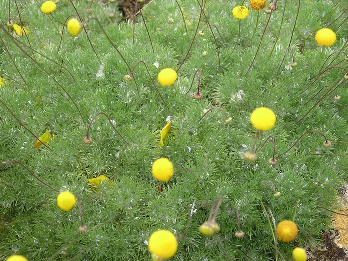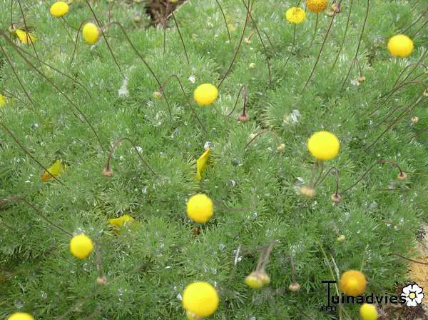 Cotula hispida est un couvre-sol à feuilles grises avec des fleurs jaunes contrastantes. Un endroit ensoleillé, sec et sans chaux, comme un jardin de rochers, est idéal.