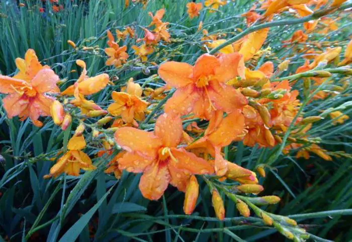 Crocosmia 'Zambesi' est une véritable étoile à la bordure avec ses tiges courbes ornées de fleurs en entonnoir jaune-orange, plus foncées au centre.