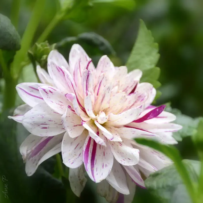 Le dahlia « Bright Diamond » est un dahlia décoratif avec des fleurs bien remplies et de larges pétales plats.Elle fleurit d’un rose doux avec des rayures rouge cerise.