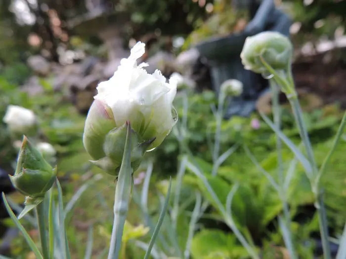 Dianthus plumarius 'Double White' est une plante basse, semi-rampante/dressée, avec des feuilles bleu-vert en forme de lame.
