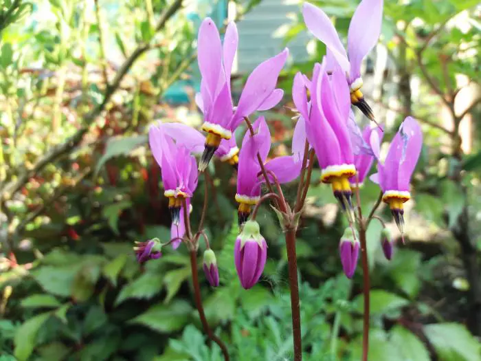 Fleurs sur tiges fines avec des fleurs blanches en tête, parfois tachetées de violet, avec des pétales repliés à l’arrière et des anthères proéminentes d’un violet foncé.