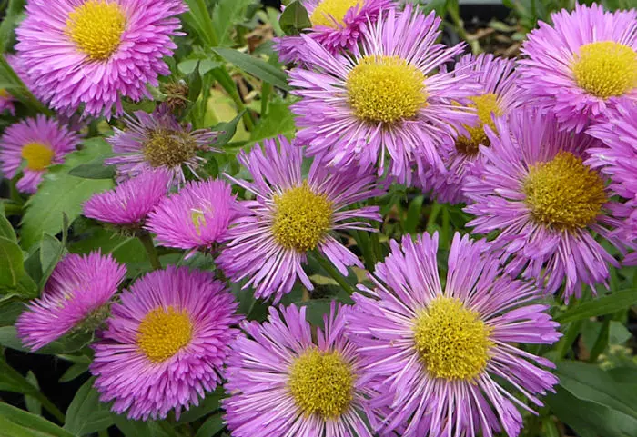 Erigeron 'Foersters Liebling' a des fleurs semi-doubles avec des fines rayons roses profonds autour d’un œil jaune.