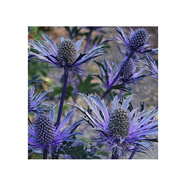 Les têtes florales vertes ou bleues sont entourées de bractées épineuses blanches, argentées, vertes ou bleu-violet. Fleurir de la mi-été à l’automne.