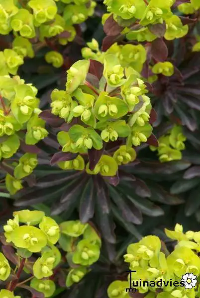 Les fleurs de couleur chartreuse, d’un jaune verdâtre, contrastent magnifiquement avec les tiges et feuilles d’un violet foncé. En hiver, les feuilles prennent une couleur plus noir-violette.