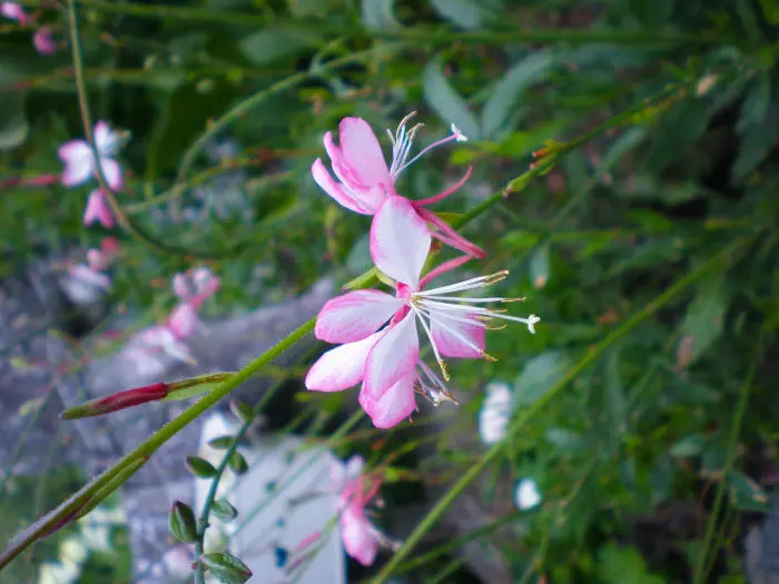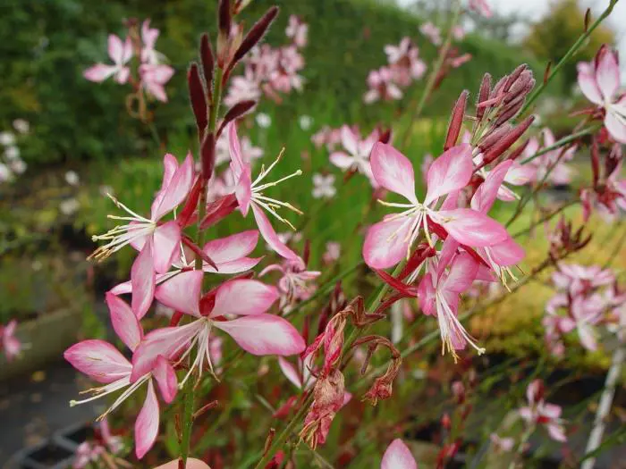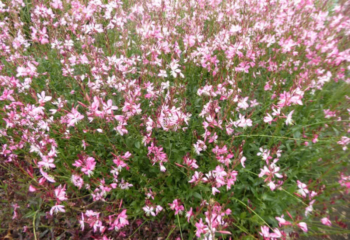 Gaura lindheimeri est une plante buissonne de courte durée avec une longue période de floraison composée de fleurs blanches à bords rosés, semblables à des papillons, issues de bourgeons roses. Fleurir sur de longues tiges fines, se balançant au vent.