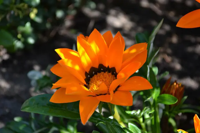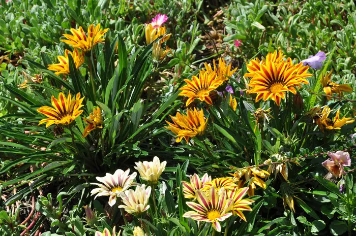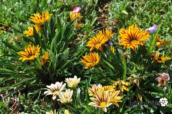 Gazania rigens 'Big Kiss White Flame' fleurit avec de très grandes fleurs. Les fleurs sont très remarquables avec leurs rayures jaune-blanc et violet-rose.