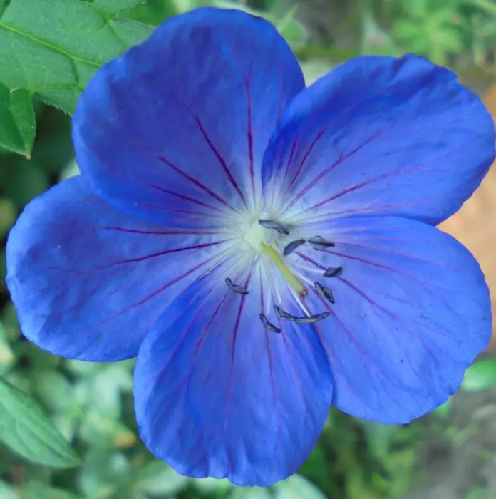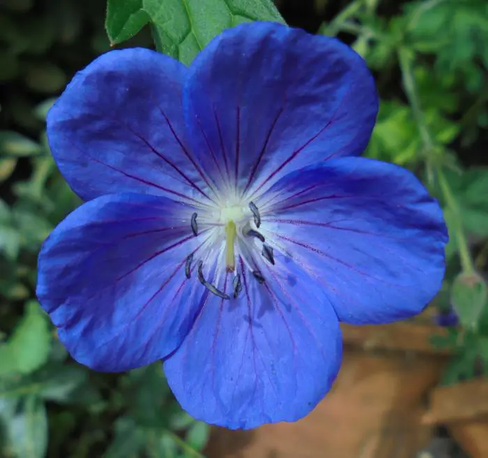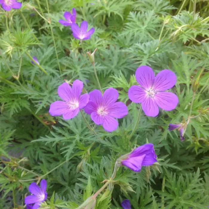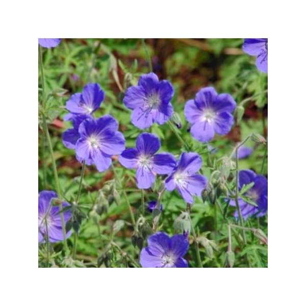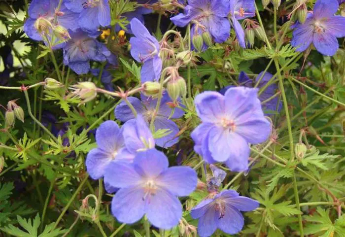 Geranium 'Brookside' a des feuilles vertes lobulées et de longues tiges avec de grandes fleurs lavande-bleu à veines foncées.