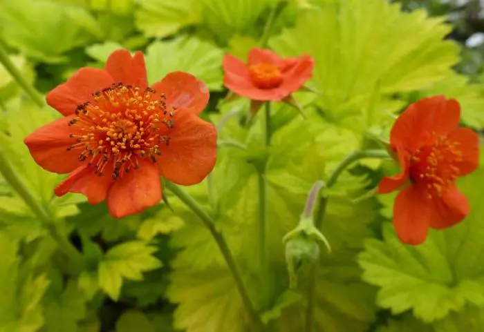 Geum coccineum 'Eos' est une plante de bordure compacte à longue fleur avec des fleurs uniques d’un orange vif et des feuilles jaunes.