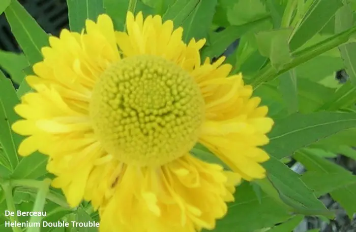 Helenium 'Double Trouble' fleurit avec de grandes fleurs doubles, jaune profond, avec un cône verdâtre-jaune au centre.