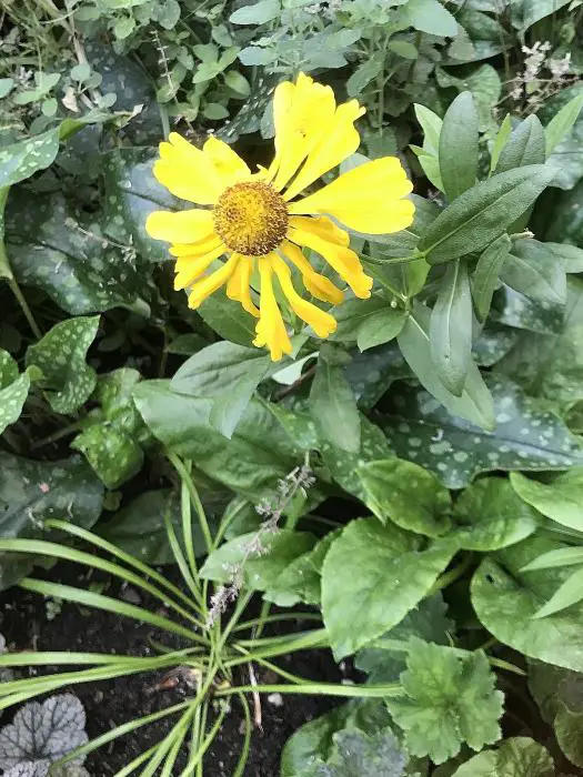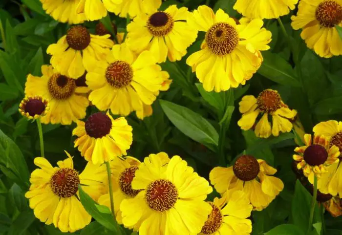 Helenium 'El Dorado' fleurit avec de grandes fleurs jaune doré. Au centre, un cône brun chocolat frappant avec des étamines jaune doré.