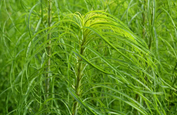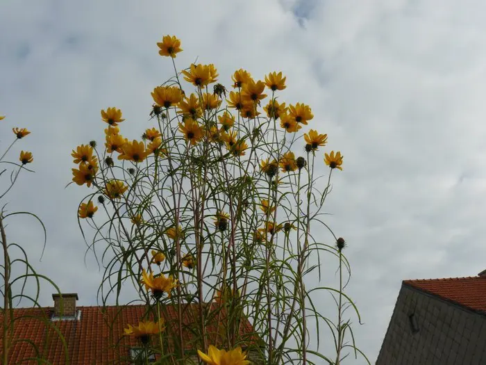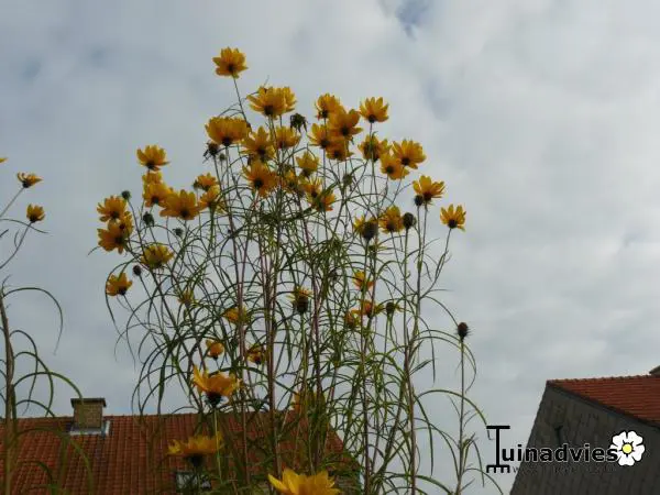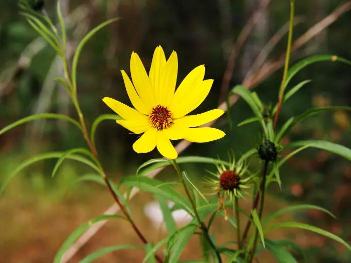 Helianthus salicifolius, originaire du centre des États-Unis, est une plante vivace rhizomateuse et grande aux feuilles vert poilues, linéaires à lancéolées.