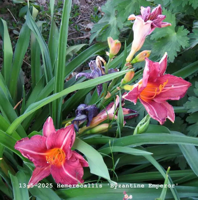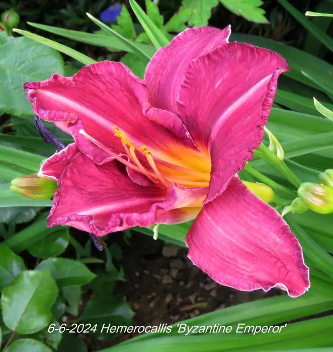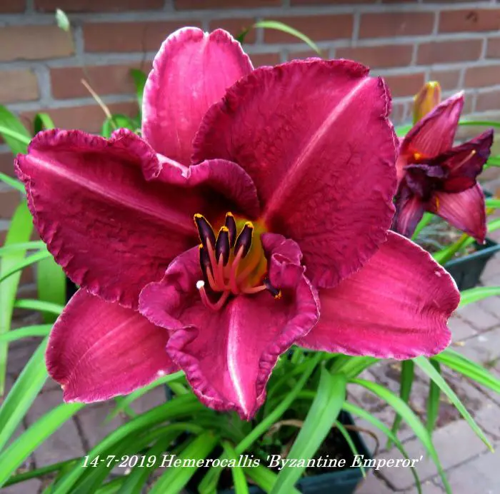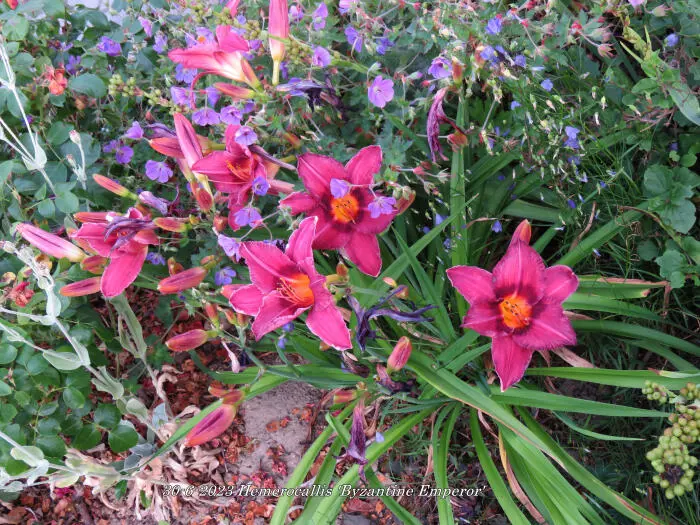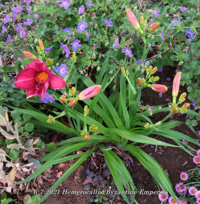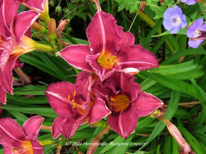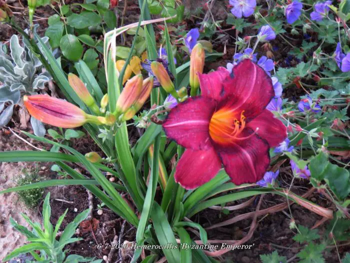 Hemerocallis « Empereur byzantin » fleurit d’un rouge vin avec un anneau violet autour d’une gorge jaune doré.