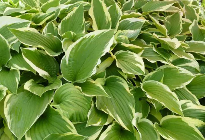 Hosta 'Antioch' possède une feuille verte en forme de cœur avec des bords jaune crème qui deviennent rapidement blancs.Fleurs avec des fleurs lilas.