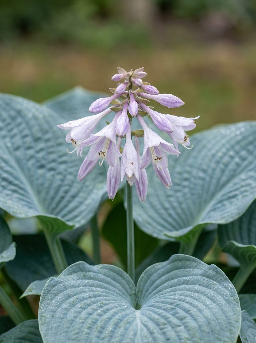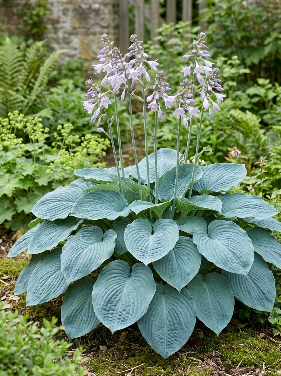 Hosta 'Blue Mammoth' possède de grandes feuilles bleues robustes et des fleurs lilas.Une sélection de Sieboldiana.