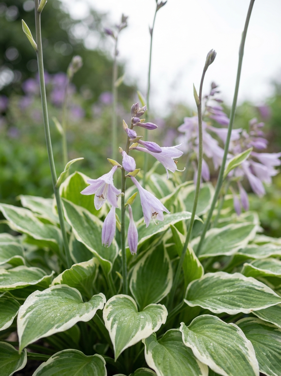 Hosta fortunei 'Moerheim' possède des feuilles vertes en forme de cœur avec des bords jaunes à blancs.
