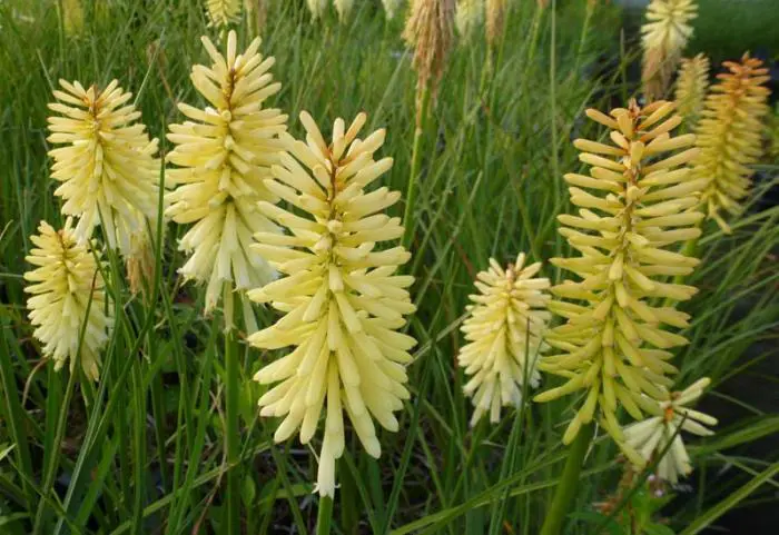 Kniphofia 'Moonstone' fleurit complètement d’un jaune crème.