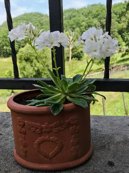Lewisia cotyledon 'Alba' pousse naturellement dans les Rocheuses, à l’ouest des États-Unis, et est donc une véritable plante de roche.