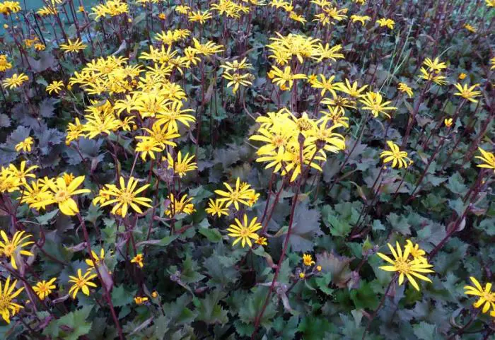 Les nouvelles feuilles bourgeonnent d’un noir violet, puis deviennent bronze à vert olive avec des veines violettes. À ce moment-là, les fleurs jaune doré semblables à des marguerites fleurissent sur des tiges violet foncé.