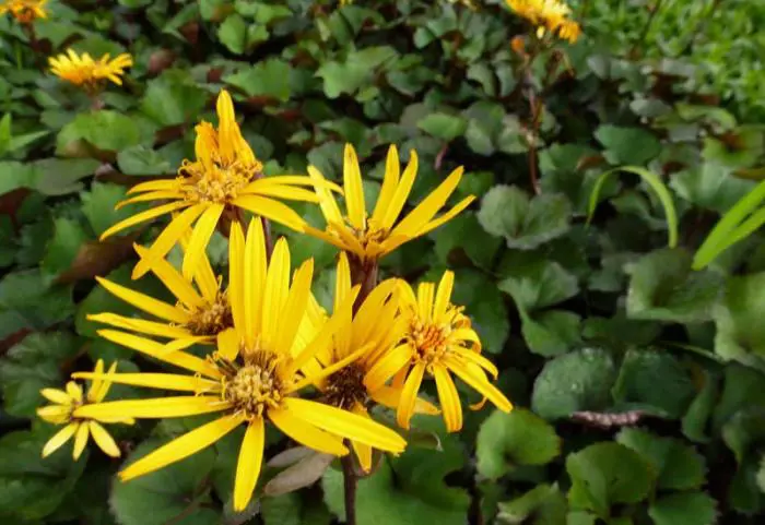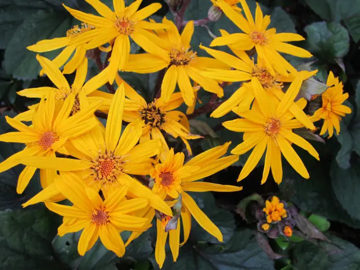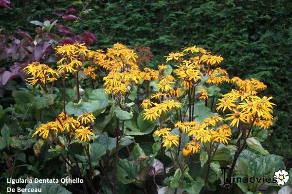 Ligularia dentata 'Othello' est une plante très décorative avec de magnifiques feuilles vert foncé à vert bronze et des fleurs jaune doré en grappes pyramidales sur des tiges hautes.