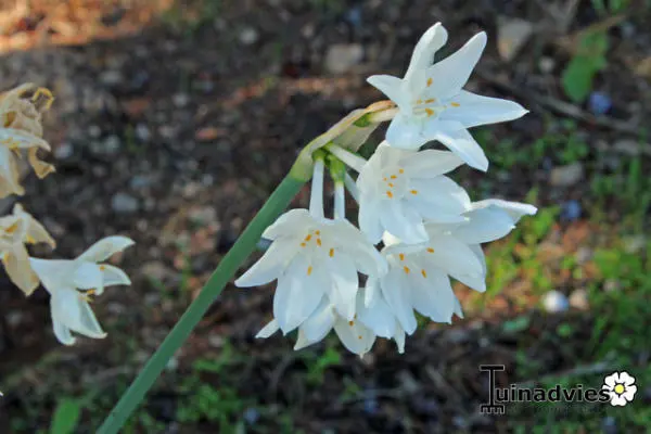 Narcissus broussonetii fleurit abondamment en automne avec des fleurs d’un blanc pur qui se marient magnifiquement aux feuilles gris-vert.