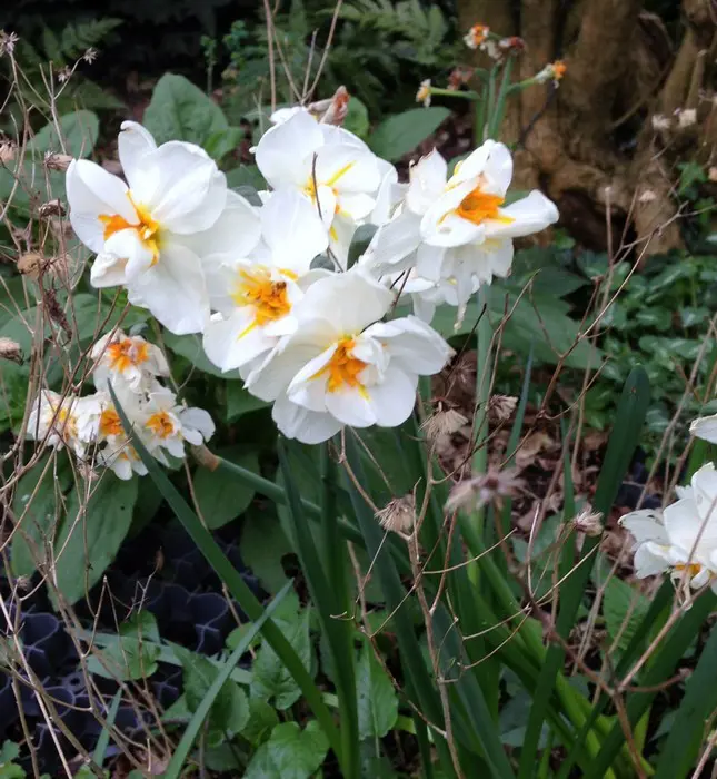 Jonquille blanche à double fleur parfumée avec des segments jaunes au centre.