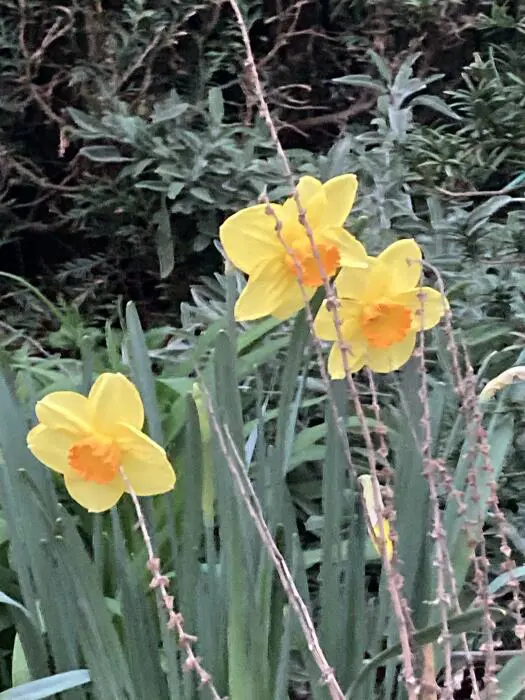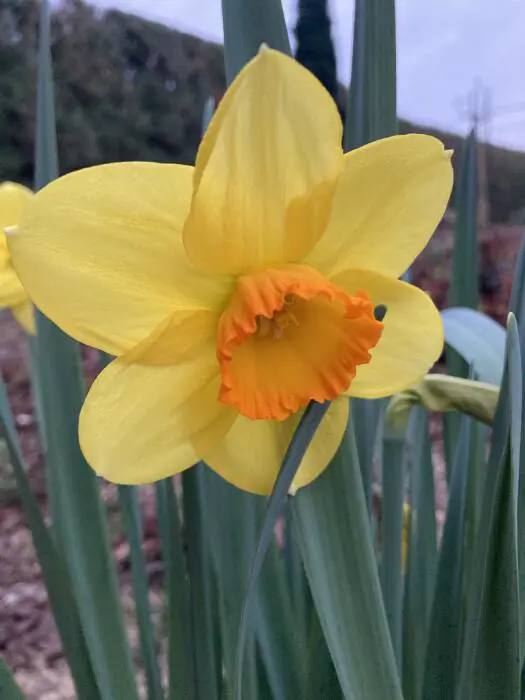 Narcisse 'Fortissimo' fleurit sur des tiges robustes aux fleurs jaune citron et une trompette orange profond ondulée sur le bord.