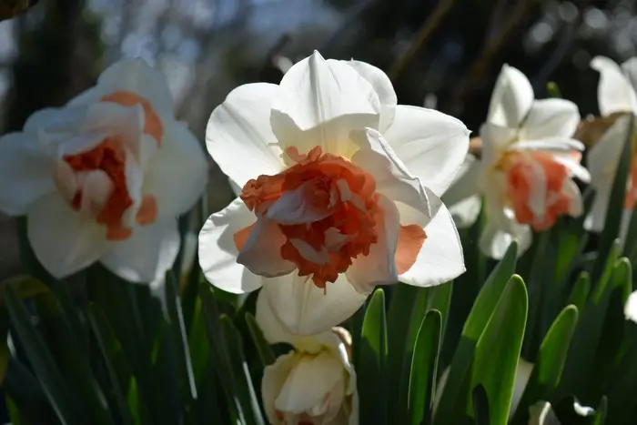 Narcisse « Mon Histoire » fleurit avec des doubles fleurs. Les fleurs sont blanches avec jaune à la base, au centre des pétales orange abricot tendre frangés.