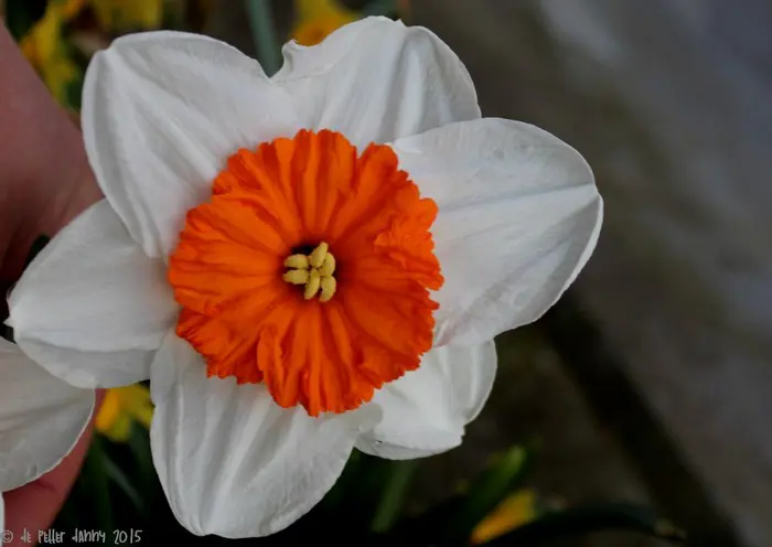 Narcisse « Professeur Einstein » s’épanouit d’un blanc pur avec une trompette orange intense.