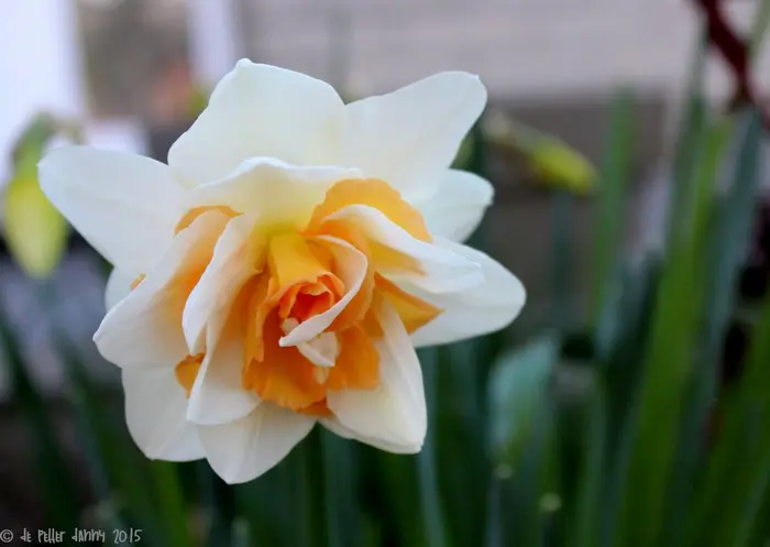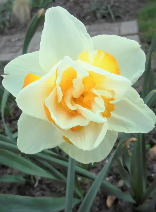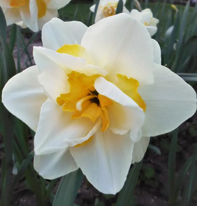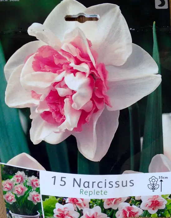 Narcissus 'Replete' est une jonquille à double fleur, blanc ivoire avec une couronne allant de l’abricot au rose saumon.