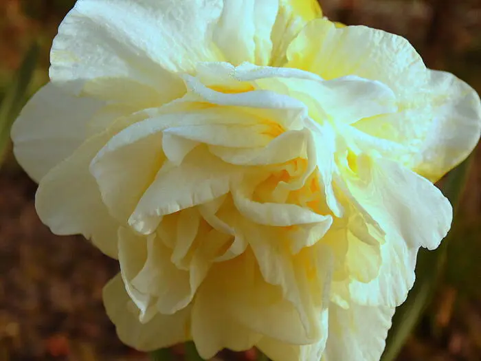 Une jonquille à double fleur blanc crème avec une couronne jaune dorée au centre.