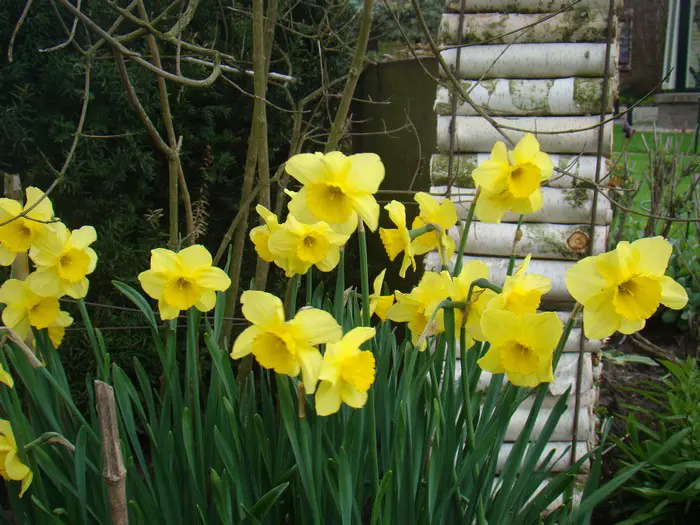 Narcissus 'Yellow Sun' fleurit avec de grandes fleurs jaunes intenses sur des tiges robustes.