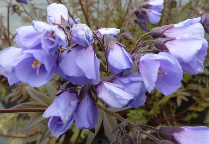 Sur les tiges sombres, les grappes de fleurs gris-bleues en forme de cloche fleurissent.