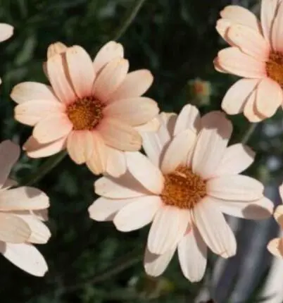 Rhodanthemum hosmariense 'Zagora Orange' forme un pollen dense composé de feuilles pinnées argent-vert et de marguerites orange bronze à orange clair avec un centre rouge/brun-jaunâtre.