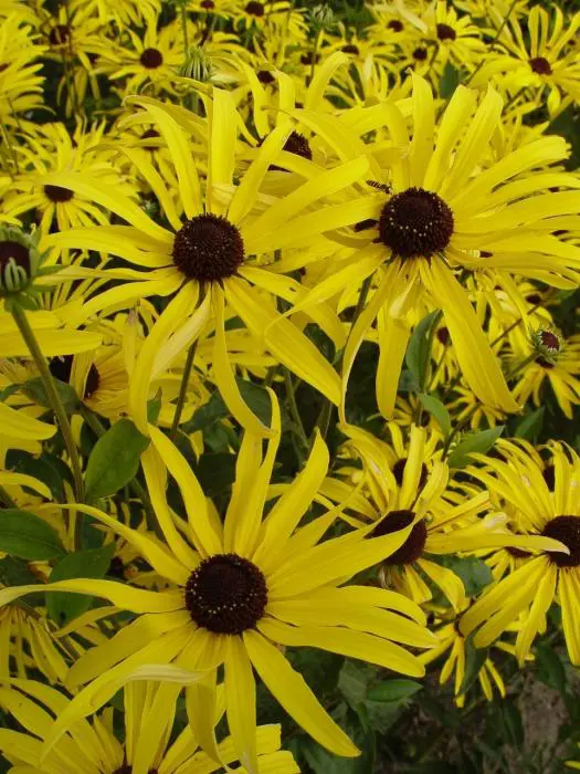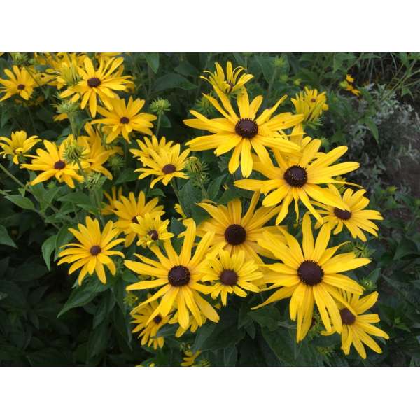 Les fleurons rayonnants, légèrement parfumés et jaune doré vif, fleurissent sur des tiges hautes, robustes et ramifiées, avec un cône brun foncé au centre.