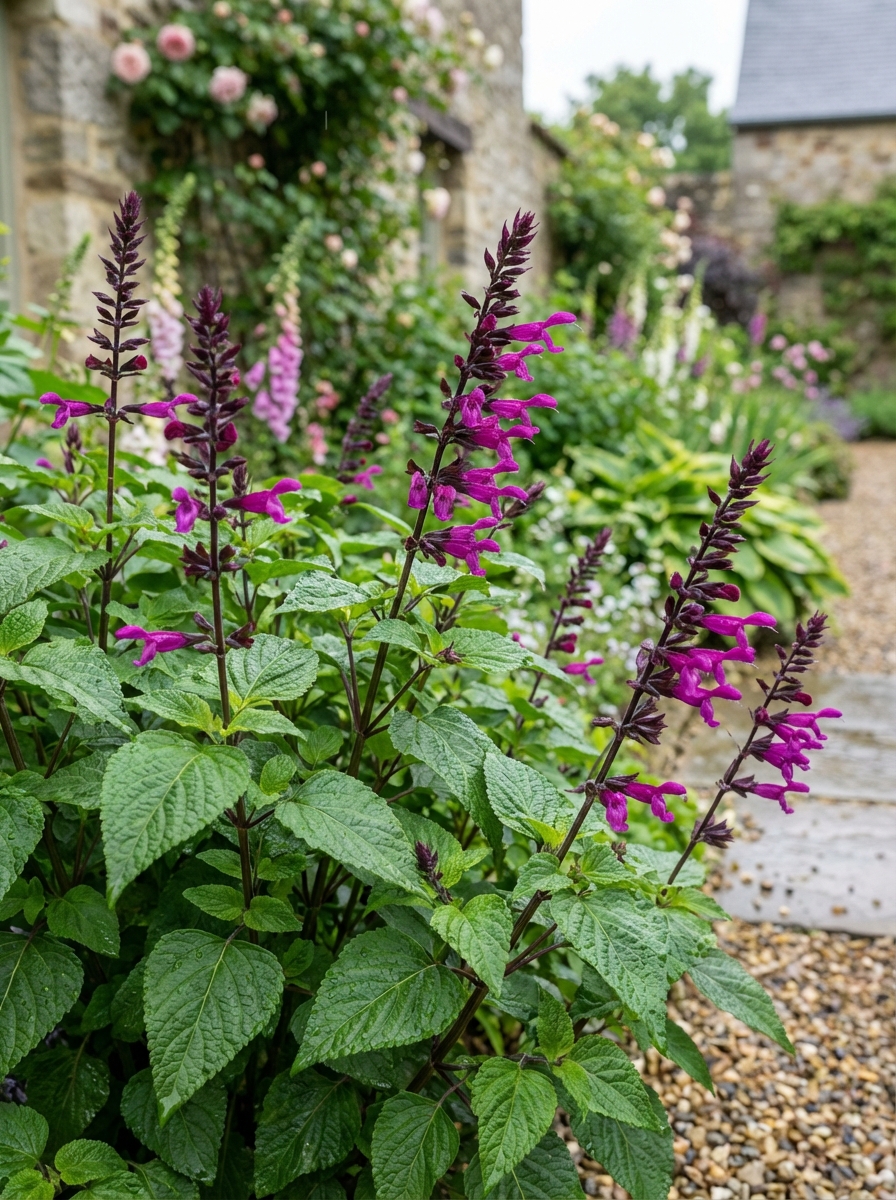 La Salvia guaranitica 'Plum Crazy' fleurit avec de grandes épines de grands sépales tubulaires rouges magenta. La feuille dégage une odeur d’anis lorsqu’elle est contusionnée.