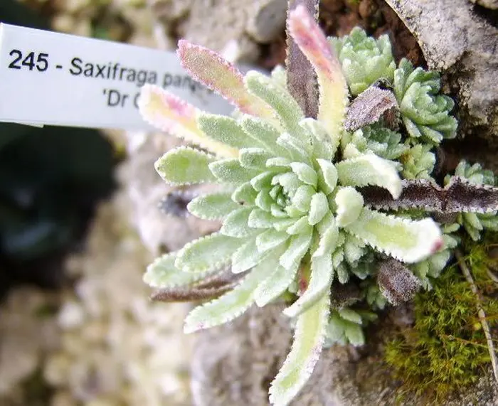 Saxifraga paniculata 'Dr Clay' pousse dans les montagnes d’Europe.